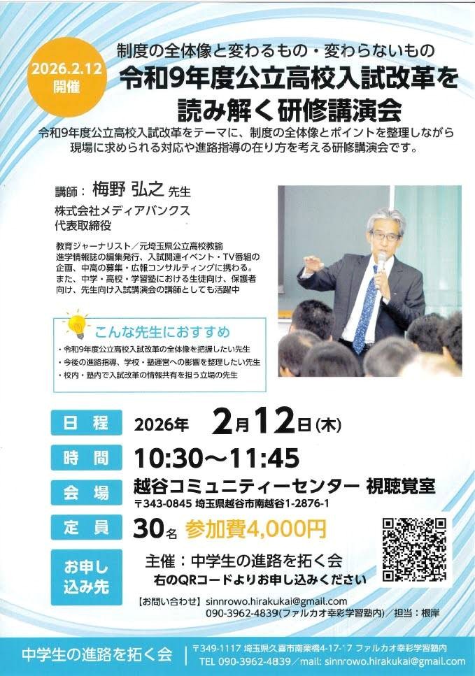 公立入試改革が、評価の不透明性や受験生の負担増につながりかねない情勢の中で、私立は「安全、安心、確実、丁寧、手厚い」といった新たな価値を提示する。これは入試制度という短期的優位ではなく、教育サービスとしてのクオリティの差という永続的優位に繋げて行けるはずだ。